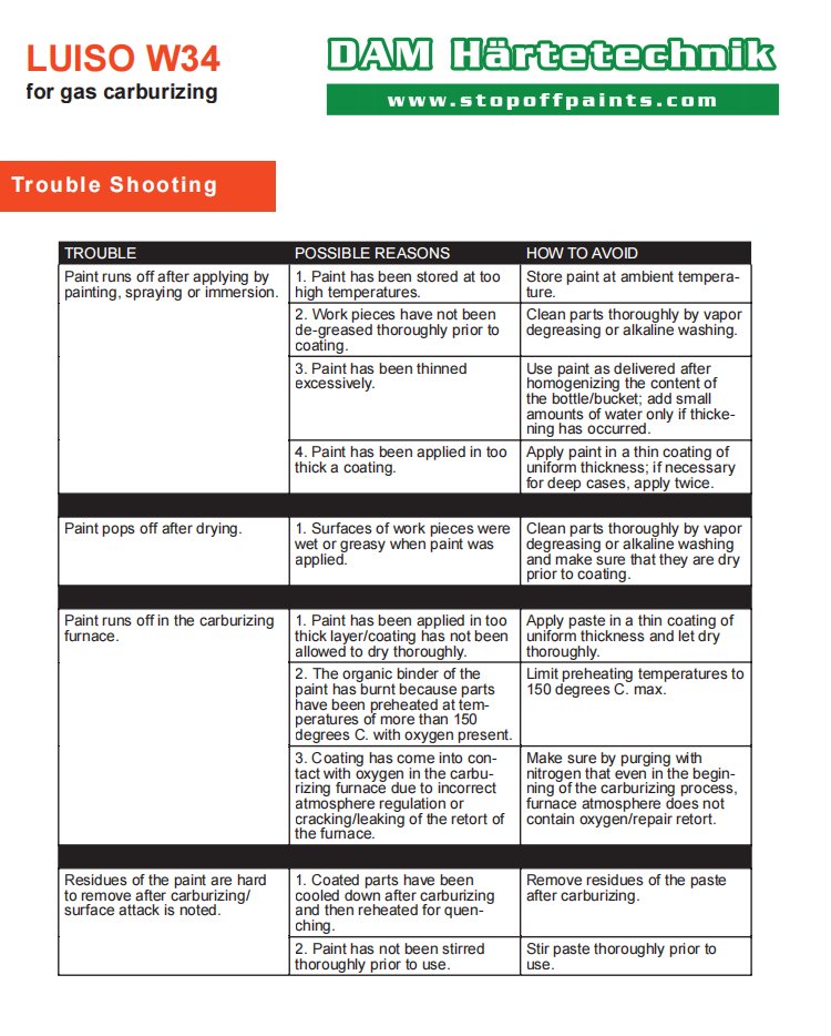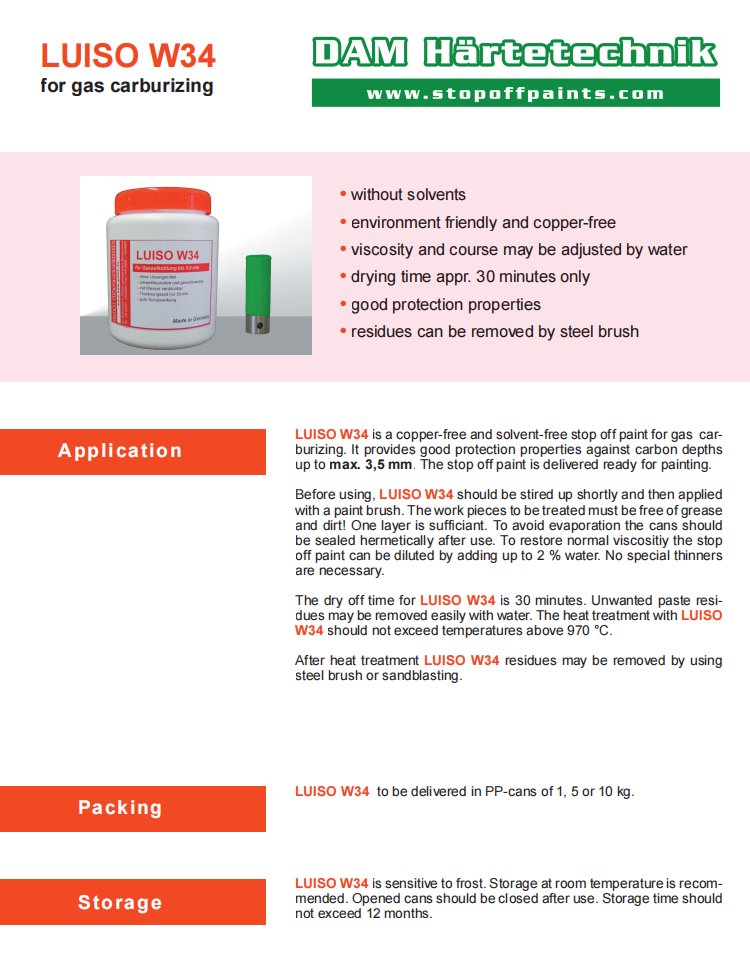 LUISIO W34 是一种用于气体渗碳的无铜停止涂料。它提供良好的保护性能,防止碳深度达到。 3.5毫米。停止油漆已交付准备进行涂漆。