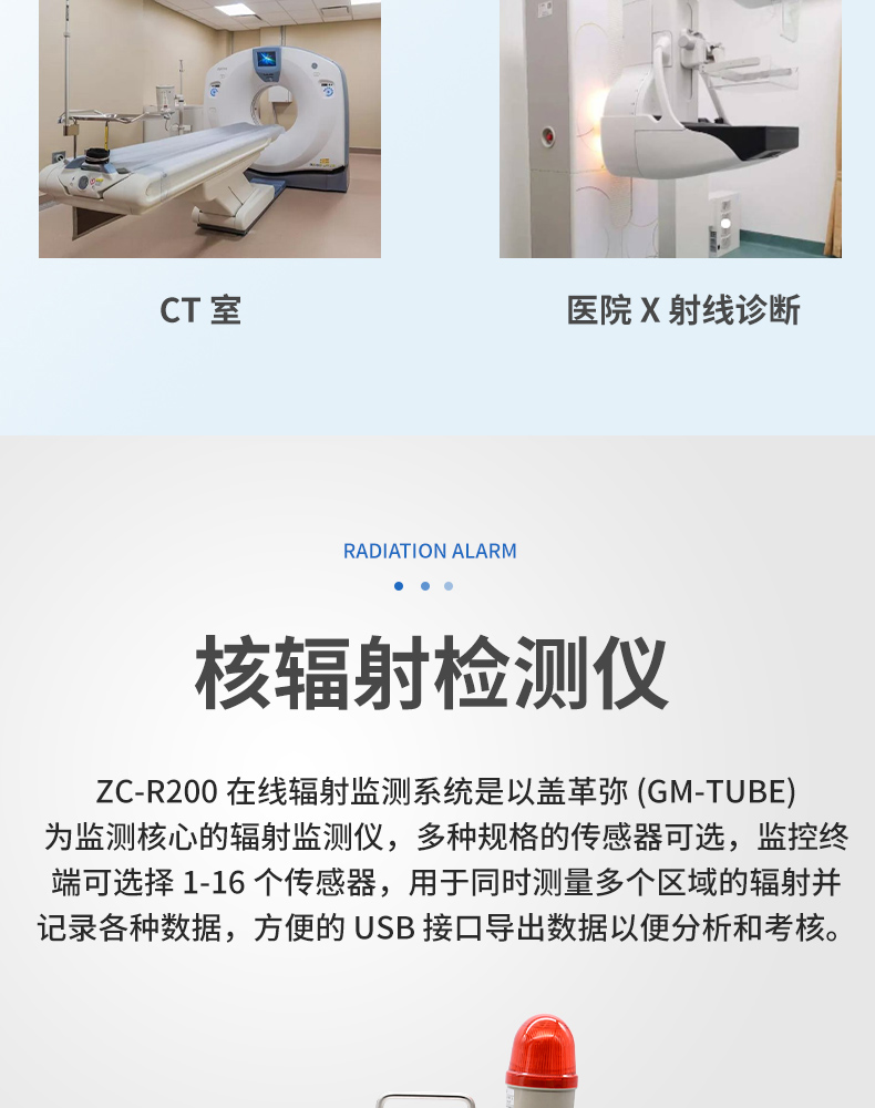 ZC-R200 在线辐射监测系统是以盖革弥 (GM-TUBE)为监测核心的辐射监测仪,多种规格的传感器可选,监控终端可选择 1-16 个传感器,用于同时测量多个区域的辐射并记录各种数据,方便的 USB 接口导出数据以便分析和考核。监控终端是一个 7 寸触控数据采集器,内置存储,可设置的报警阀值,标配声光报警装置;同时输出 RS232 ,协议modbus-rtu 协议。该仪器广泛应用于放射性废物库、工业无损探伤、CT 室、医院γ刀治疗、同位素应用、 γ辐照、医院 X 射线诊断、钴治疗、核电站、海关等以及可能存在放射性的场所;时刻帮助工作人员了解放射源或射线装置已处于工作或泄漏状态,以保证人员的健康和安全。