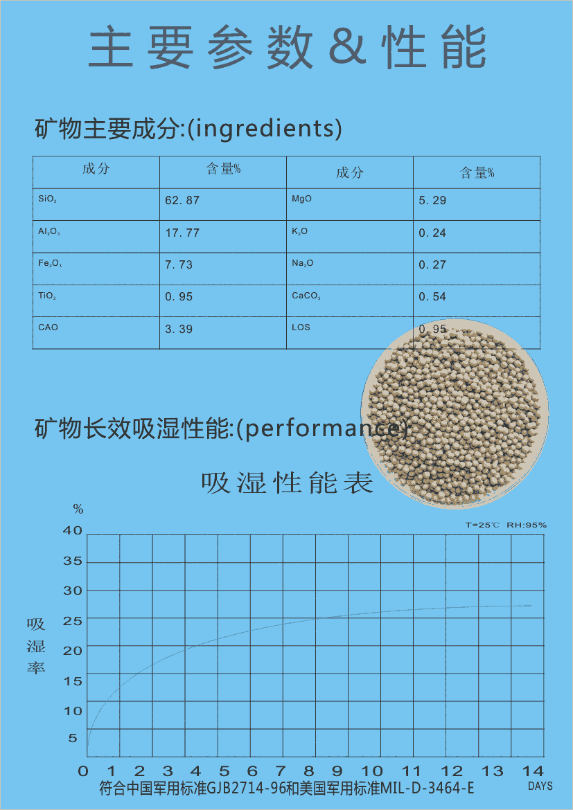矿物干燥剂由天然的矿石矿开采后经高温加热,有机质碳化,蒙脱矿体膨化,蒸气处理,烘干干燥、活化、破碎、过筛精选而成。是一种天然的、无毒的、无公害、可降解性的健康绿色环保干燥剂,不含任何添加剂和没有腐蚀性物质,也没有氯化物,产品质量标准符合中国军用标准GJB2714-96和美国军用标准MIL-D-3464-E.