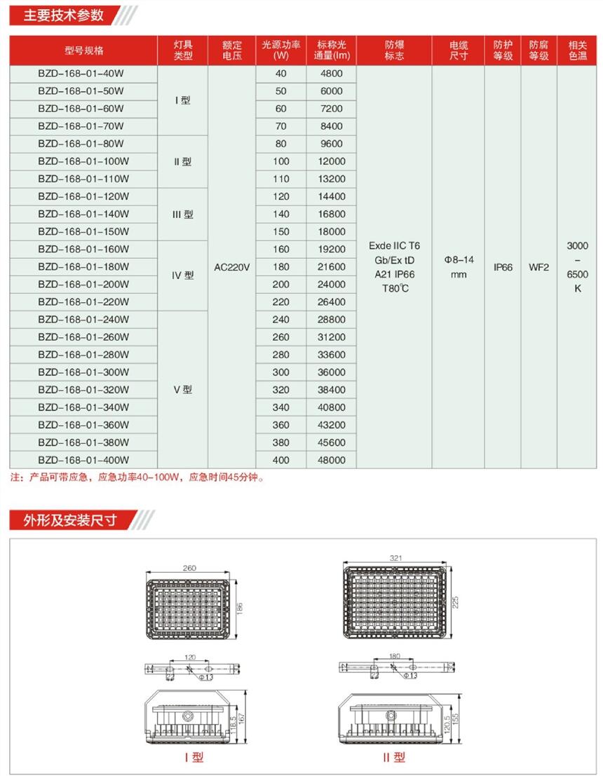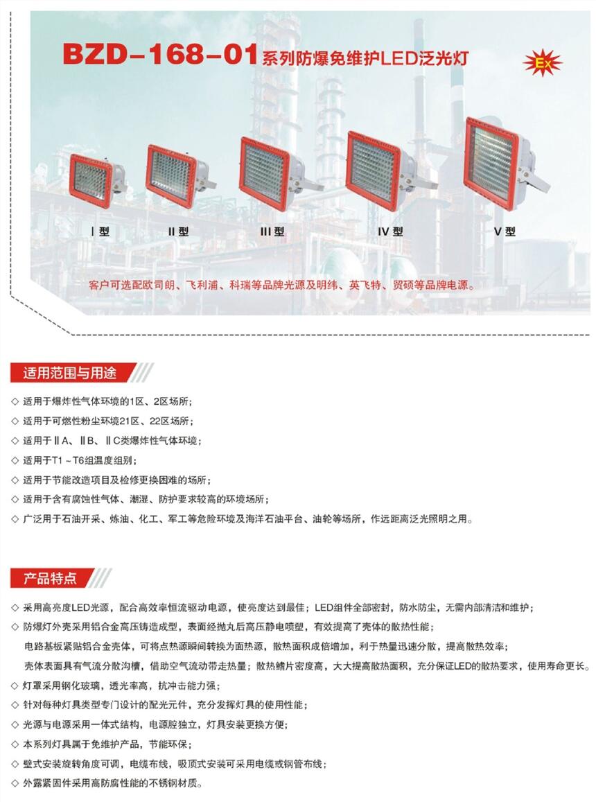适用于ⅡA、ⅡB、ⅡC级爆炸性气体环境; 适用于温度组别为T1~T6的环境; 适用于石油采炼、储存、化工、医药、军工设施等爆炸性危险环境; 用作厂区或道路照明;