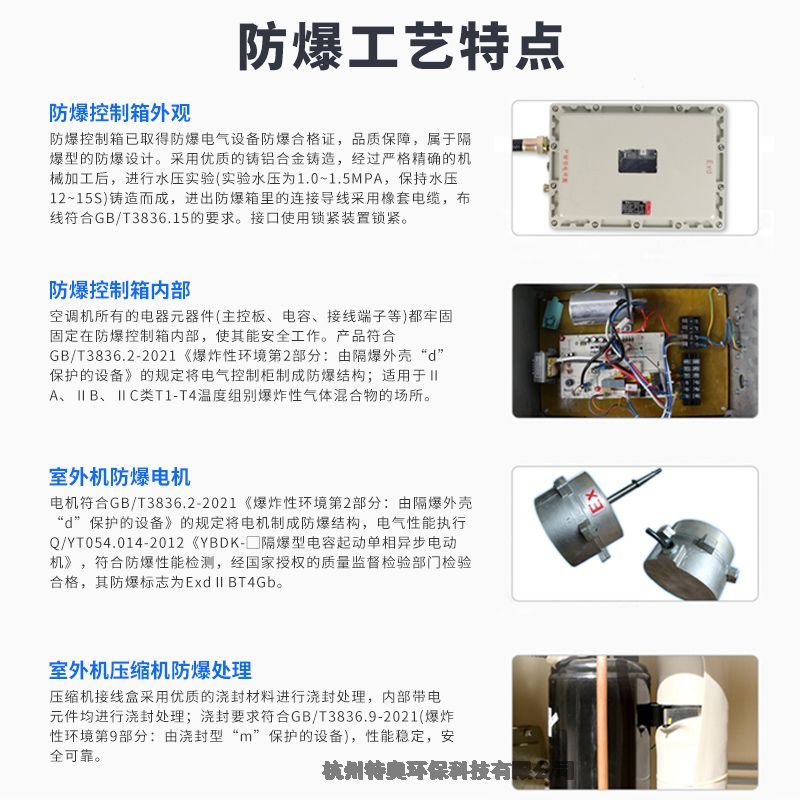 产品具有制冷制热和自动除霜功能,压缩机、风机等都经过特殊的防爆处理,防爆类型为整机防爆。防爆产品可应用于石油、化工、医药、科研、军事、危险仓库等易燃易爆的混合性气体环境中使用。在结构上采用隔爆型、本安型、浇封型等复合防爆技术,控制端全由本安型控制,不产生任何电火花,使用方便安全,采用高效多翅式换热器,冷煤通过时与空气的接触更充分,能大幅度的提高空调的制冷制热效果。