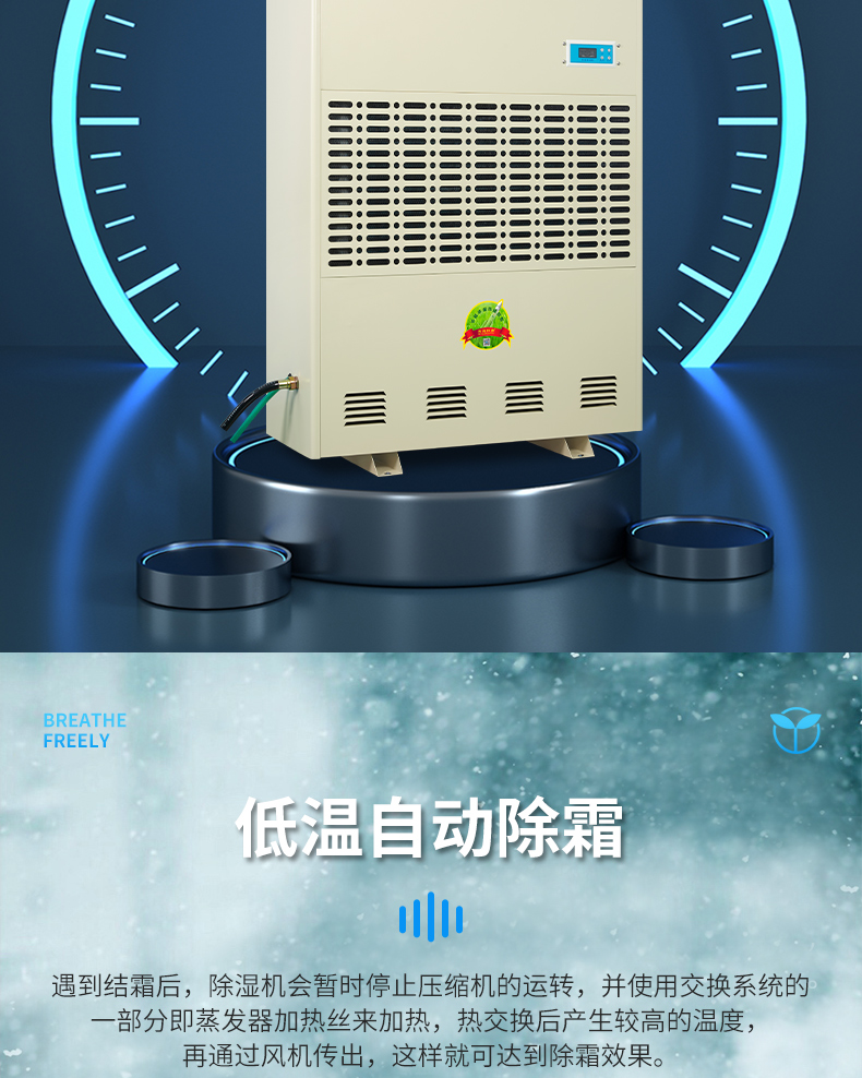 本产品属冷冻式除湿机,整机有压缩机、热交换器、风扇、机壳及控制器组成,其工作原理是:由风扇将潮湿空气抽入机内,经过制冷系统(压缩机,蒸发器,冷凝器)相互作用下凝结成霜,系统自动升温化霜成水流入盛水箱,产生出干燥空气排出,如此循环使室内湿度降低,潮湿空间逐步达到干爽的效果。