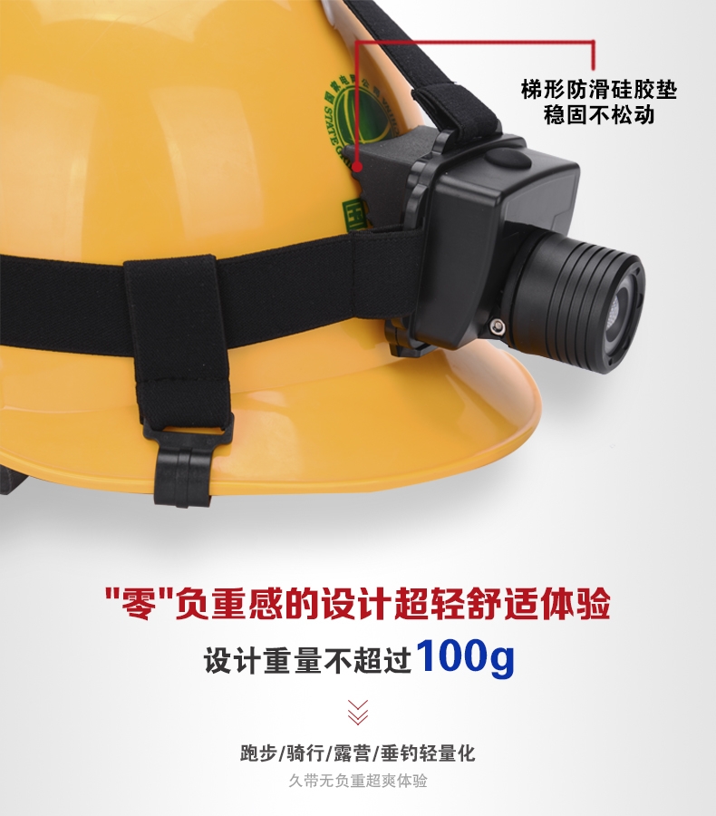 轻便耐用:外形灵巧美观,体积小、重量轻,人性化设计,可直接头戴或安装在头kui上使用,头带柔软、弹性好长短可调,照明角度可随意调节,适合头部佩戴使用