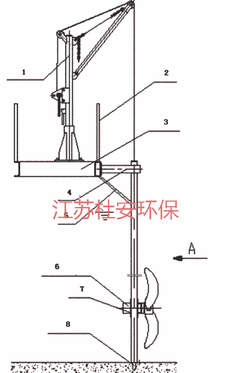 潜水推流器通过安装在池底的导杆和托架组件水平安装在污水处理构筑物内。导杆和托架组件由导杆和托架组成,导杆上下部分别安装在池壁和池底上,托架安装在池底并且与导杆连接成整体。施工时,通过膨胀螺栓或预埋件将导杆和托架组件固定在构筑物基体上。安装潜水推流器时,通过池面上的起吊系统将推流器上的滑套套入与之配套的自耦导杆中,将潜水推流器下放到托架上固定即可。当进行维护保养时,起吊系统通过自耦导杆将推流器提升到池面上。