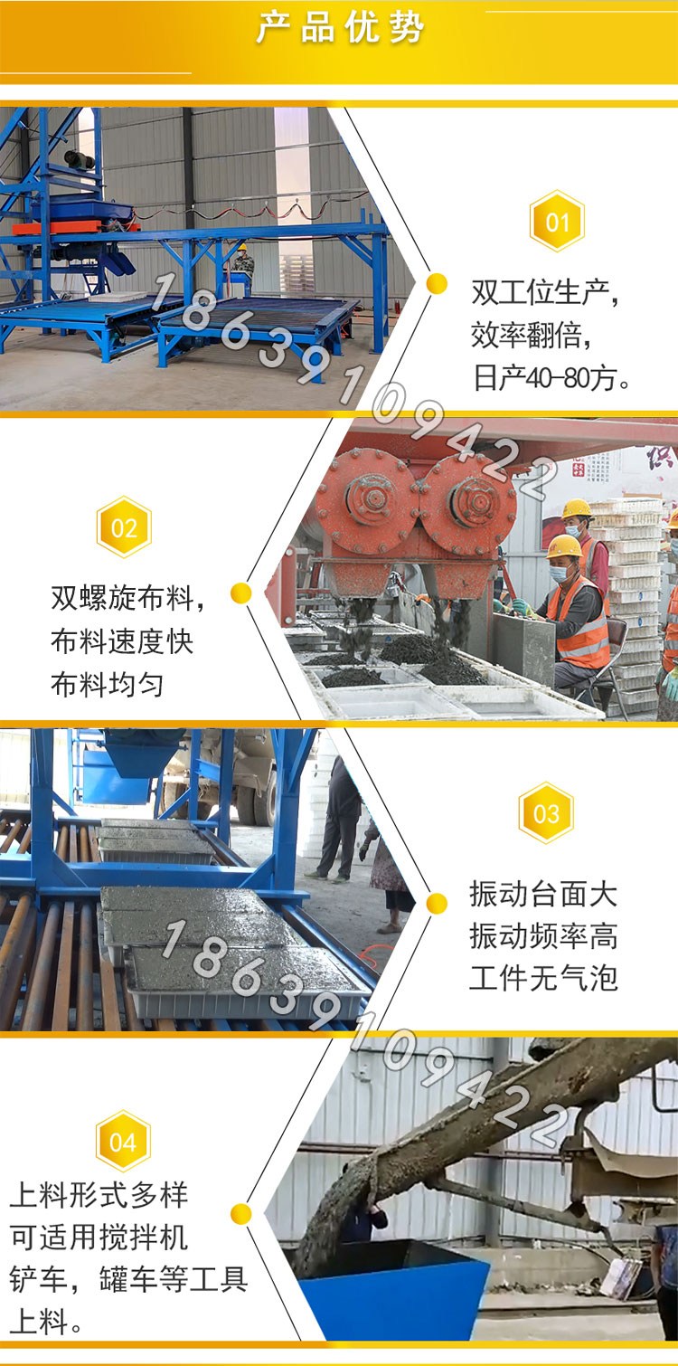 预制件加工流程 1、斜拉上料负责从罐装车中接混凝土,讲混凝土斜拉提升至移动接料系统; 2、移动接料系统内含有自动称重系统和双螺旋下料系统; 3、振动称型系统内含高频率振动器,快速振动成型; 4、智能操控箱控制整套设备所有系统运转,触摸屏操作,简单,快捷。 5、滚动输送:输送、积累成型预制块,转运晒场时一次转运多块,提率。 6、清洗踏步:休息期间方便工作人员清洗移动接料系统内残余混凝土。 小型预制构件生产线 流水槽预制设备 铁路护坡预制块的设备。
