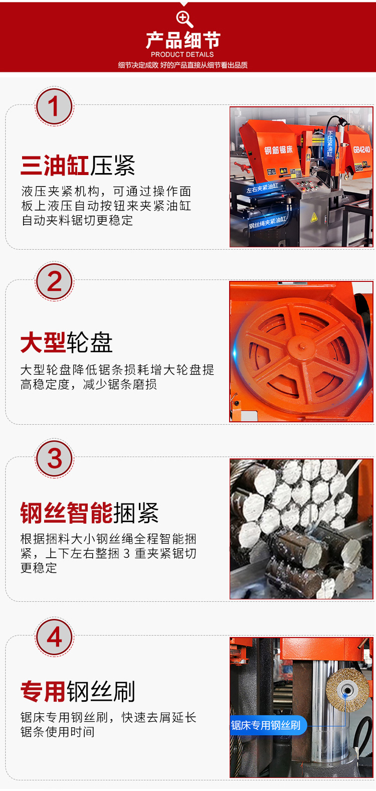 性能及配置: 1.采用机械、液压、电气一体化控制,**、运行。 2.采用蜗轮蜗杆减速机 3.工件采用液压加紧 4.切料进给:采用液压无极调速 钢筋专用带锯床 数控液压角钢带锯床 工字钢锯床切割机。