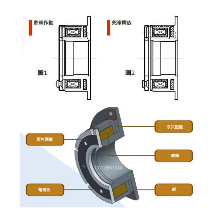 1、刹车作动:线圈在电流切断下,永久磁铁的磁力会将电枢板吸附,产生而定扭力。