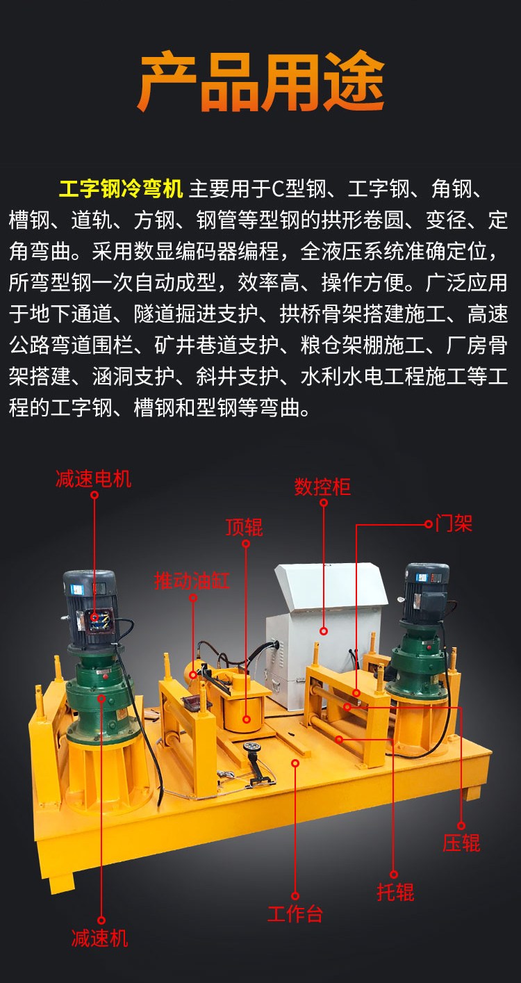 工字钢折弯机 18号工字钢冷弯机 220型工字钢冷弯机, 我厂专业研讨出产型材冷弯机械,从1998年初步一向秉承以机械有用价值为中心,首要针对修建工程施工钢筋曲折,铁路高速施工钢材加工,矿井巷道支护型材曲折加工,不断立异研制。
