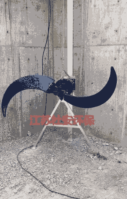 潜水推流器通过安装在池底的导杆和托架组件水平安装在污水处理构筑物内。导杆和托架组件由导杆和托架组成,导杆上下部分别安装在池壁和池底上,托架安装在池底并且与导杆连接成整体。施工时,通过膨胀螺栓或预埋件将导杆和托架组件固定在构筑物基体上。安装潜水推流器时,通过池面上的起吊系统将推流器上的滑套套入与之配套的自耦导杆中,将潜水推流器下放到托架上固定即可。当进行维护保养时,起吊系统通过自耦导杆将推流器提升到池面上。