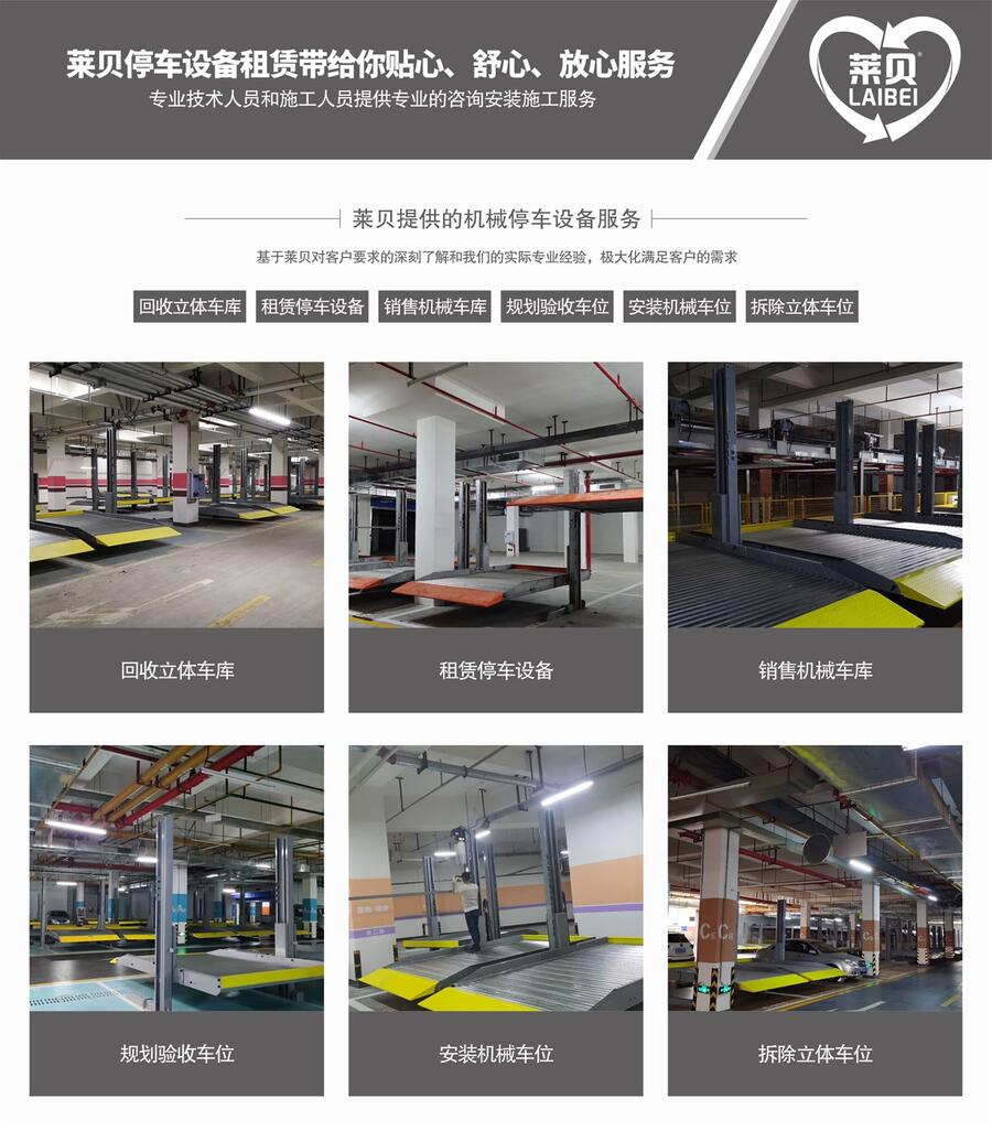 四川莱贝停车设备有限公司经营现货租售机械式停车位、两层立体停车设备安装,移动车库之活动板房使用注意事项1.不要任意或试图拆卸任何一个螺丝及部件。2、室内地坪需高于室外50,室外应修好排水沟。3、非不得改变板房任何结构。4、楼面每平方米的荷载值不得大于合同所规定的静载、荷载准值。5、请不要在室内使用明火炉具。6、请勿在楼上跳跃、奔跑。7、使用门窗时请轻推轻关。8、对于容易被腐蚀的钢构件要定期进行除锈、刷漆、翻新等维护工作。9、不提倡用户在户外在活动房内设置厨房,如设置在活动房屋内,请安装好抽油烟机设备,且火源离墙体不得小于50cm。主要有:现货租售机械式停车位、两层立体停车设备安装、简易升降式、升降横移升降式。该产品具有占地面积少、空间利用率高、安装方便、能耗低、噪音小等特点,适用于各种场地和建设要求。公司为客户提供立体车库规划计划、施工设计、安装调试、运营培训、术支持、机械停车设备销售、租赁、回收等多项服务,直至客户满意。