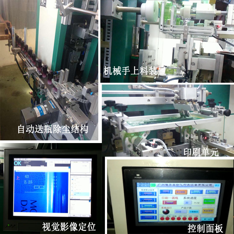 机器结构主要由自动送瓶结构、自动除尘装置、机械手自动上料结构、伺服系统传位结构、自动印刷主体(印刷系统)、UV全自动温控紫外线固化系统组成。采用模块式程控处理器和触摸屏显示控制系统,运行更平稳。夹具少易于更换瓶形,调试安装简单,操作更方便。核心部件采用全安川伺服系统,视觉定位装置,机器稳定,精度高,套色精准。