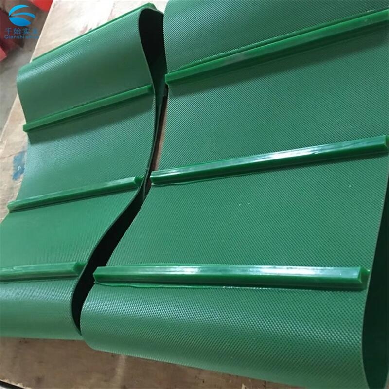 绿色裙边挡板pvc输送带主要应用在包装行业,物流行业,电子行业,食品行业,水产品,烟草行业,蔬菜,水果,茶叶,颗粒产品,粉状产品物料的输送,具有良好的效果,既能保证在高坡度的环境中,不至于下滑,散落。我们主要采用机械接头,机械热硫化接驳,直接让群边,挡板,导条与输送带融为一体,的利用皮带的特性,对输送带无伤害,使输送带的使用寿命更长。同时经过特殊加工还可做成导向带、提升带、裙边带等。