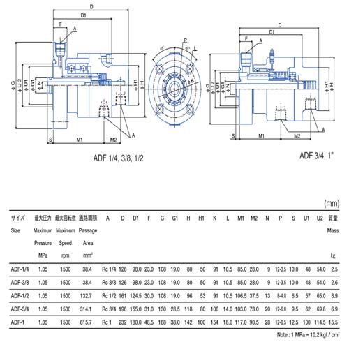 空压用2通路旋转接头是通过轴端部2个独立通路供给流体的。因此,2个通路可流动不同流体。外部配管接续部出入口是JIS管用锥形螺纹。