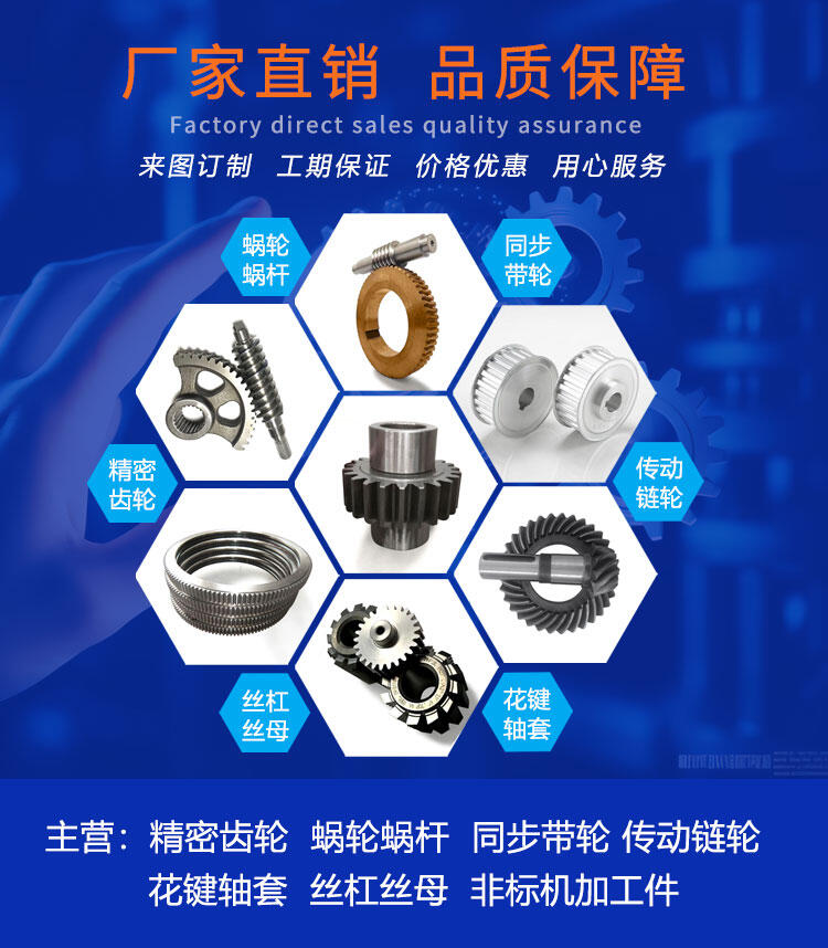 公司经营的产品有:齿轮、齿条、链轮、链条、蜗轮、蜗杆、伞齿轮、螺旋伞齿轮、同步带轮、联轴器、皮带轮、多楔带轮、花键轴、花键套、万向节、锥套、涨紧套等传动件,同时,本公司可以根据客户要求来设计加工非标规格的产品公司产品广泛应用于印刷机械,旋转压片机,码垛机,焊接设备,食品机械,包装机械,灌装机械,输送机械,数控机床,航空航天,机器人等自动化生产线