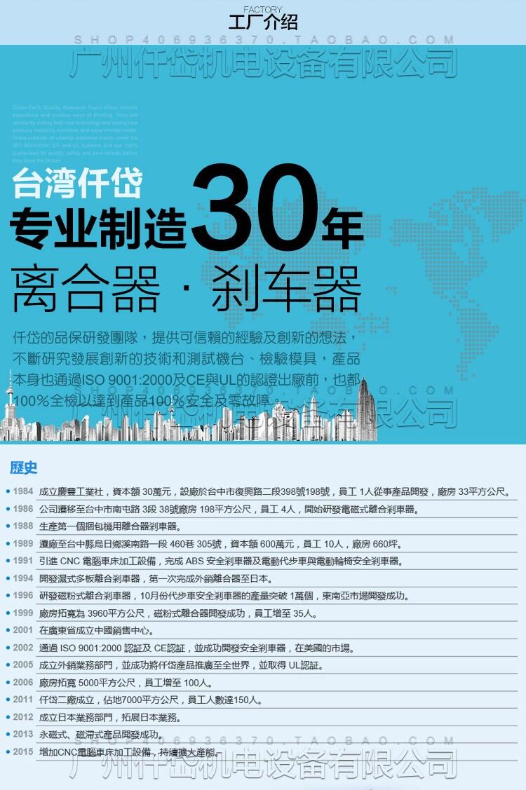 仟岱有限公司专业生产各式机械用电磁式单板离合器、制动器,电磁式安全制动器,电磁式湿式多板离合器、制动器,电磁式磁粉离合器、制动器,已经 20几年,秉承研发创新的精神及不断提高产品品质为本公司宗旨。