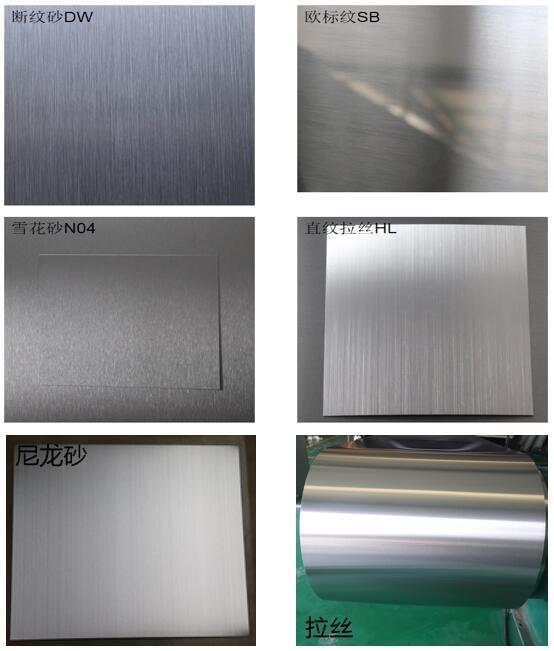 产品表面描述厂家生产加工:磨砂、油磨拉丝、400#雪花砂、磨砂拉丝、直丝纹(HL)、雪花砂(N04)、欧标纹(SB)、断纹砂(DW)、尼龙纹、亮面拉丝等。 | |