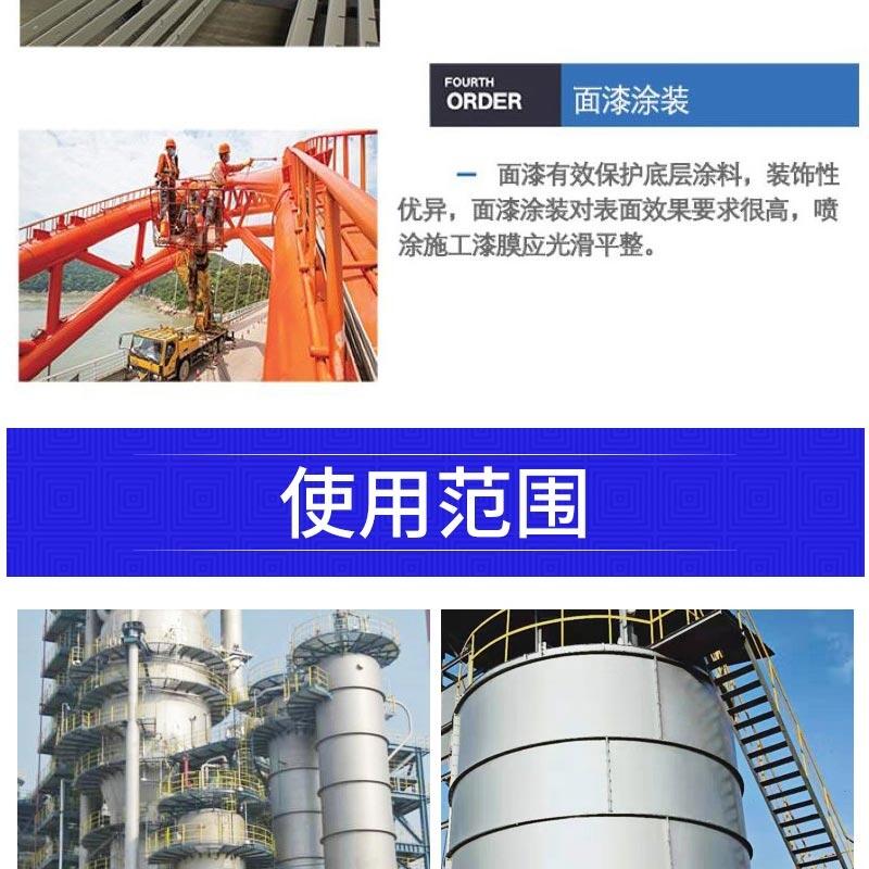 本漆具有优异的耐热性,并具有防腐性和耐候性,常温自干固化,干燥迅速,施工方便。该漆装钢铁、铸铁、碳钢等材质,配套涂装,漆膜颜色多样,具有好的装饰性。