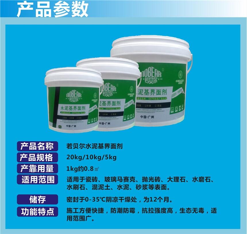 久固若贝尔防水混泥土界面剂,水泥界面剂,界面剂砂浆,外墙界面剂,室内界面剂,是一种聚合物改性水泥砂浆,能够增强对基层的粘结力,具有良好的耐水、而湿热、抗冻融性能、避免了抹灰层空鼓、起壳的现象从而代替人工凿毛处理,省时省力。