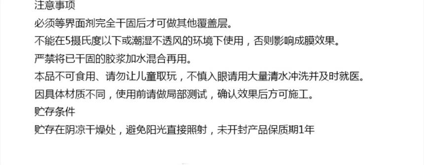注意事项:下雨进切勿进行室外施工;要求施工温度在5摄氏度以上;储存丰阴凉干燥处,未启封的产品有效期为12个月。
