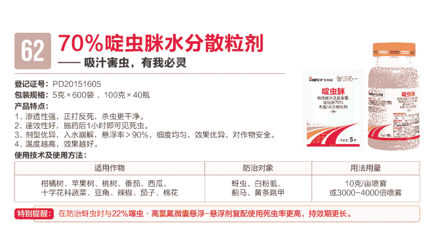 1、优利普专业针对抗性西瓜黄蚜、花椒蚜虫、桃树蚜虫等抗性蚜虫而定向开发,死虫高峰期在药后10小时,胃毒更彻底,内吸持效长。