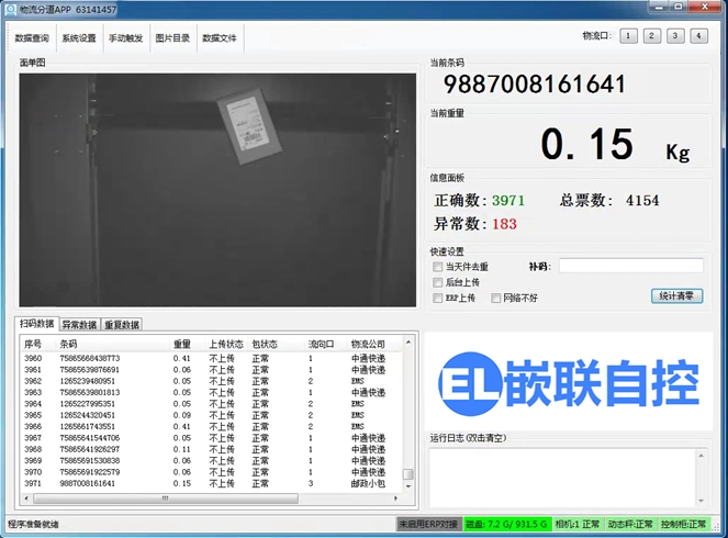 称重读码系统可以实现包裹条码和重量的动态采集与读取。称重读码系统由读码子系统与动态秤组成。货物经过读码称重区域时,通过光电传感器触发高速读码相机拍照读码。相机会将读取到条码(物流单号或者追溯码)发送给工控机。同时动态秤也会读取当前货物的重量发送给工控机。运行在工控机的上位机软件将条码与重量信息通过预设的方式进行融合绑定,再经过去重、规则比对等一系列计算后,筛选出有效的单号发送给后台系统进行查询,后台返回结果后经过规则映射得到该货物的分拣口号。工控机会将货物对应分拣命令发送给分拣系统,由分拣系统将货物分拣到规定的分拣口。所有处理成功的货物单号、重量信息与照片都会保存到本机以备查询与导出。