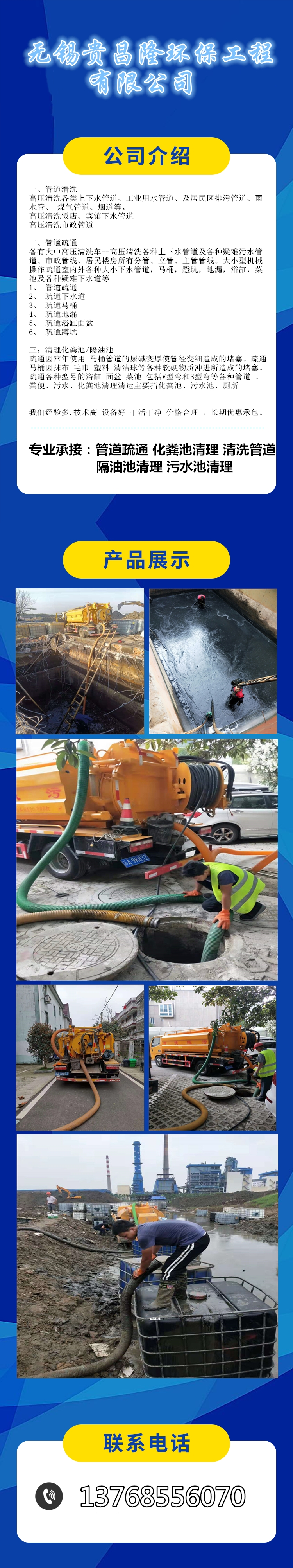 承接各种疏通及管道??清洗业务,服务于:管道工程服务;市政管道维修;市政管道疏通;建筑物清洁服务;城市水域垃圾清除服务;污水处理;管道安装工程;给排水工程;管道、管件、五金配件销售;防水工程;房屋维修;河道清淤;明暗渠清淤;污水运输;提供活性菌泥;化粪池安装;水暖工程;清洗地热;管道化冻;办公保洁。学校,物业,商场,单位,家庭及厂矿,,对公打款!经验丰富,价格合理,