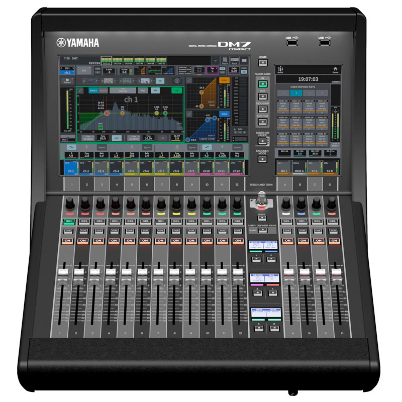 DM7 是配备 Dante 的多功能数字调音台,具有出色的音质、易操作性和高可靠性,使其成为广泛应用场合的完美选择。 DM7 配置有 24 + 4 个推子和一个 2 x 12+ 1 x 7” 多点触摸屏。
